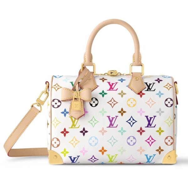 The Speedy Soft 30 makes an impact in supple coated canvas featuring an allover Monogram print in a vibrant rainbow palette as part of the re-edition of the Louis Vuitton x Murakami collection. The two Toron top handles and coordinating removable shoulder strap are crafted from tone-on-tone calf leather. Metallic corners recall detailing on the...