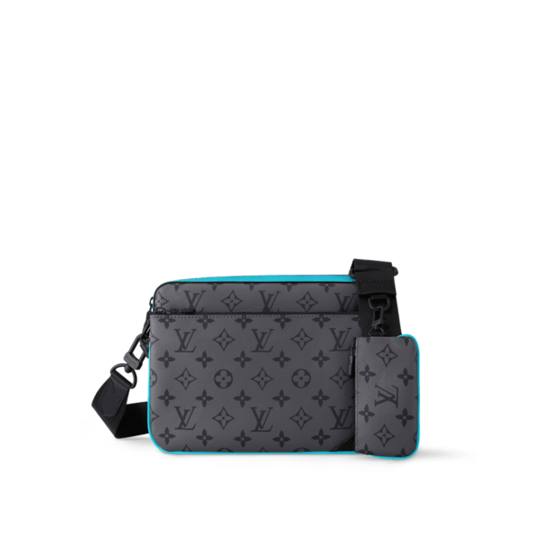 Fashioned from Monogram Eclipse Reverse canvas with turquoise highlights, the Trio Messenger bag is three bags in one. In additional to the main pouch, there’s a detachable zipped pocket on the front, and removable coin purse attached to the strap. An adjustable and removable textile strap, signed Louis Vuitton, enables comfortable shoulder carry. 25 x...