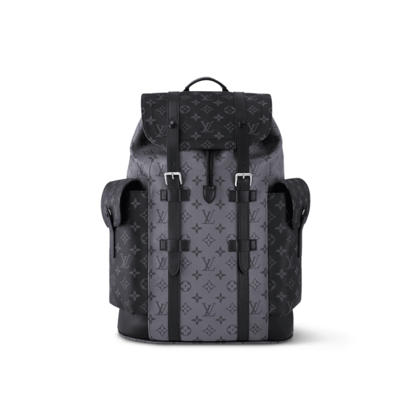 The Christopher Medium Backpack features masculine Monogram Eclipse and Monogram Eclipse Reverse canvas with black leather trim, giving it a rugged, hiking-backpack feel. The grey and black tones complement the silver buckles and zippers. Multiple pockets and a leather flap with snaps ensure your belongings are securely stored. 38 x 44 x 21 cm (Length...