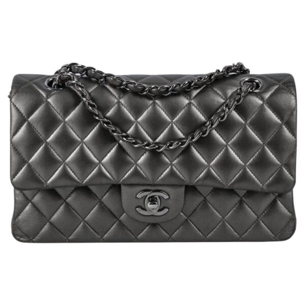 Exquisite Chanel Medium Double flap bag for sale in Metallic Grey, almost a pewter/gun metal colour. Finished off with ruthenium hardware - beautiful. A preloved item in Very Good condition. Colour Gun Metal Material Leather Hardware Ruthenium Height / Width/ Depth 16 cm / 25 cm / 7.5 cm Size Medium