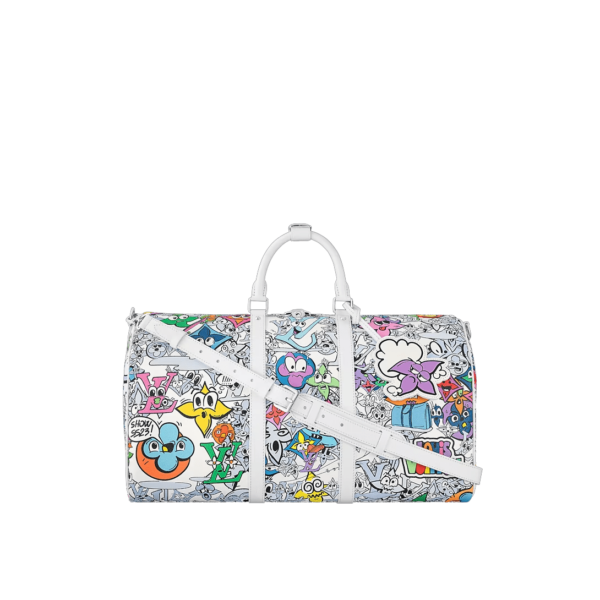 This Keepall Bandoulière 50 in canvas is adorned with a comic-book reimagining of the Monogram motif. Hundreds of characters, happy and sad, in the shape of Monogram Flowers and LVs adorn the bag. The top handles and lateral bands, in white leather, make it instantly recognizable as a Keepall. The cartoon name tag can be...