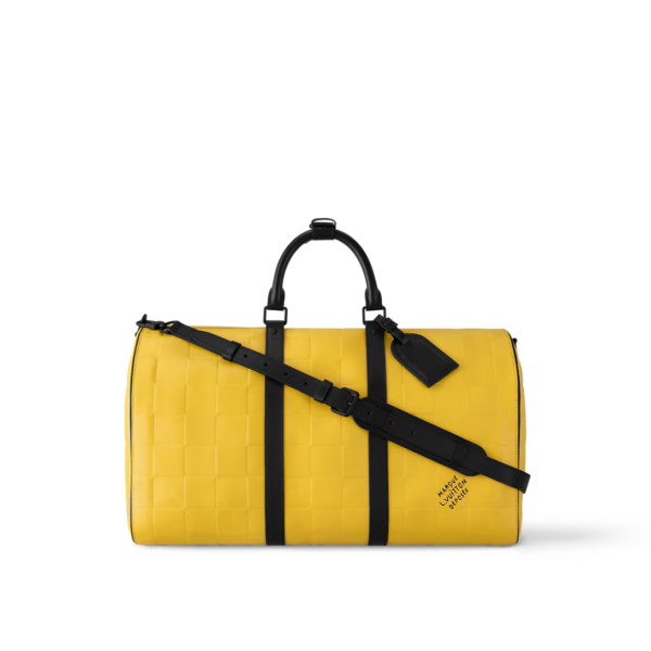 Creative Director Pharrell Williams reimagines the Keepall Bandoulière 50 in his Damier Scuba calfskin leather, a vibrant flash of yellow. The supple calfskin is embossed with the Damier pattern and backed with a layer of neoprene to give the bag a unique feel. The black-leather top handles and lateral bands underscore the sporty, nautical design....