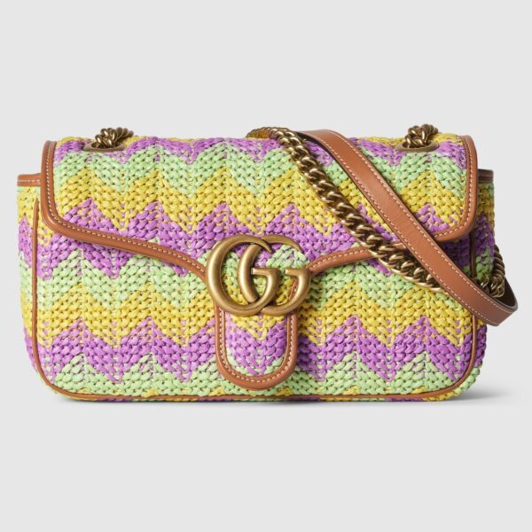 Inspired by the summer spirit and beach clubs on the Italian coast, this item is part of Gucci Lido. The small GG Marmont chain shoulder bag has a softly structured shape and an oversized flap closure with Double G hardware. The sliding chain strap can be worn multiple ways, changing between a shoulder and a...