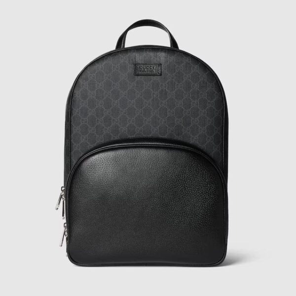 A selection of bags, including mini cross-body bags, briefcases and totes have been reshaped with functional details. Crafted from black leather and GG Supreme canvas, this backpack features an inside pocket and outside pocket. A Gucci Made in Italy leather tag completes the design as an elegant logo touch. Black GG Supreme canvas Black leather...