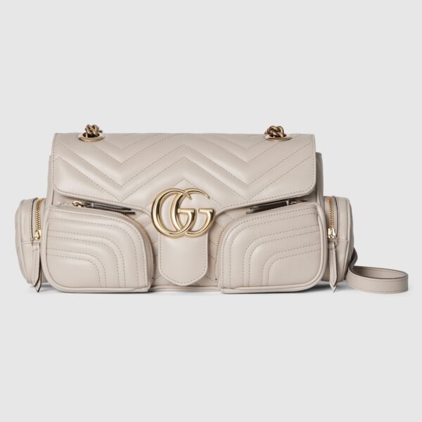 The GG Marmont line has always combined innovative material and design, and for Pre-Fall, multiple zip pockets placed on the outside further emphasize the geometry and sophistication of the matelassé chevron leather. Brown leather lining, light gold toned hardware, and an adjustable leather and chain shoulder strap completes this small shoulder bag. Ivory matelassé chevron...