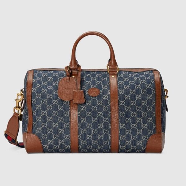 Style 681133 2KQQT 8391GG denim, a signature material seen both in The handbags and ready-to-wear selections. Here The unmistakable jacquard returns as Part of The Gucci Love Parade collection, enriching Classic luggage styles With The allover motif. A brown leather trim completes This duffle bag, while The blue and red Web strap adds a subtle...