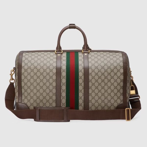 Inspired by the summer spirit and beach clubs on the Italian coast, this item is part of Gucci Lido. Introduced within the Gucci Savoy line, this duffle bag is crafted from beige and ebony GG Supreme canvas combined with the distinctive combination of the House Web with Double G hardware. The top-handle shape is also...