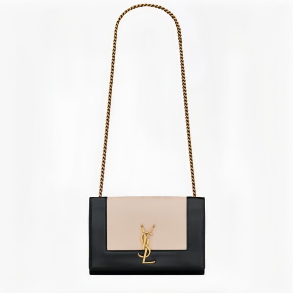 TWO-TONED, LAMBSKIN, NAPPA LEATHER BAG, WITH THE CASSANDRE AND ENGRAVED CURB-LINK CHAIN SAINT LAURENT. GROSGRAIN LINING LIGHT BRONZE BRASS HARDWARE MAGNETIC SNAP TAB ONE INTERIOR SLOT POCKET DIMENSIONS: 7.8 X 5.1 X 2.3 INCHES 19.8*13*5.8CM CHAIN LENGTH: 13.3 INCHES