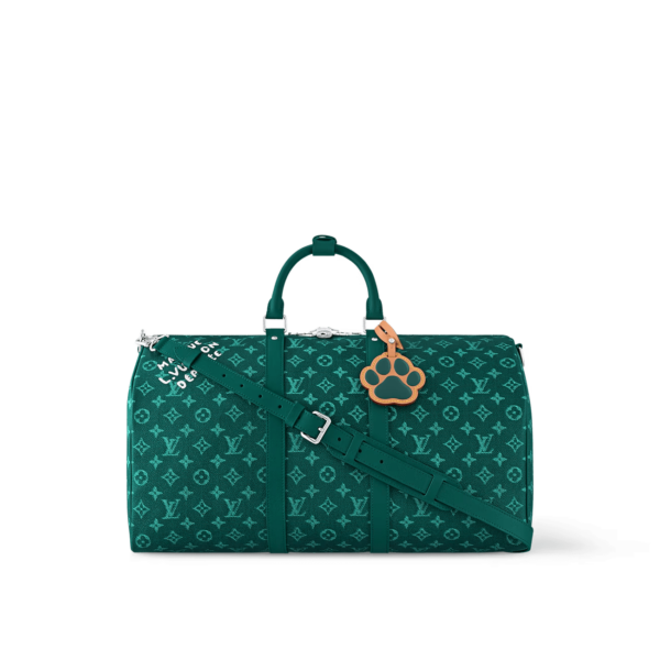 Pharrell Williams brings playful color to the Keepall Bandoulière 50 with Monogram Heritage canvas. The Monogram is reinterpreted with heritage details originally found on the Damier canvas, such as the “Marque L.Vuitton Déposée.” Attached to one of the top handles is a padded charm in the shape of a dog’s paw embossed with LV Initials....