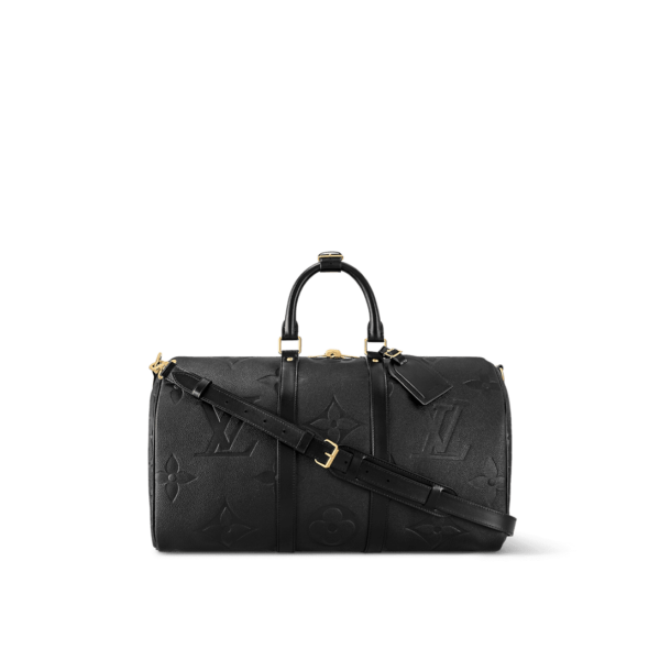 This Keepall Bandoulière 45 is fashioned from Monogram Empreinte Giant leather with gold-color hardware. The supple black cowhide is embossed with an oversized Monogram pattern, giving an understated elegance to this classic soft travel bag. Inside, the colored lining brings a graphic feel whilst the zipped pocket makes it functional. 45 x 27 x 20 cm...