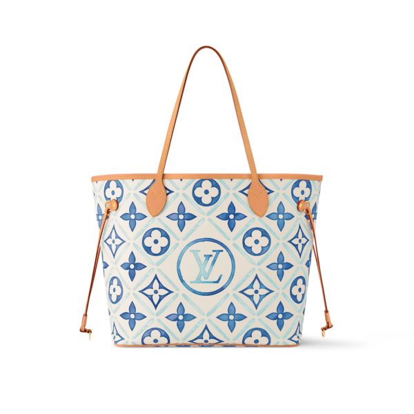The Neverfull Medium Tote Bag is crafted from Monogram Tiles canvas, with leather trim on the top and handles. The Monogram pattern features a watercolor style and a central LV circular logo. It includes a separate zip-up pouch with a matching printed pattern. 31 x 28 x 14 cm (Length x Height x Width) Lago...