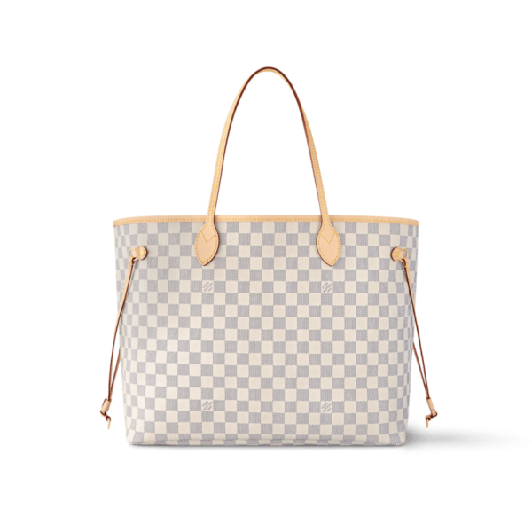 The Neverfull PM tote pairs timeless design with heritage details. Crafted from Damier Azur canvas with natural cowhide trim, it is capacious yet not bulky, with side laces that cinch for a sleek allure or loosen for a casual look. Slim, comfortable handles slip easily over the shoulder or arm. Lined in colorful textile, it...