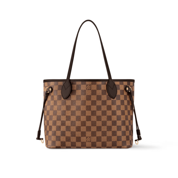 The Neverfull PM tote pairs timeless design with heritage details. Crafted from Damier Ebene canvas with natural cowhide trim, it is capacious yet not bulky, with side laces that cinch for a sleek allure or loosen for a casual look. Slim, comfortable handles slip easily over the shoulder or arm. Lined in colorful textile, it...