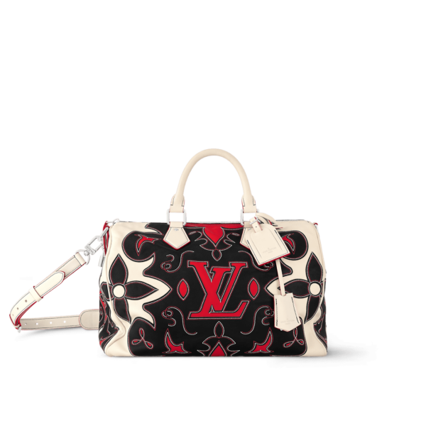 Inspired by the work boots of the American West, this striking LV Arabesque Speedy 40 Bandoulière features an all-over stitched pattern. Monogram Flowers and LVs are mixed with Arabesque lines in vivid shades of red, white, and black. The pattern is crafted from a patchwork of three layers of cut leather, meticulously assembled one by...