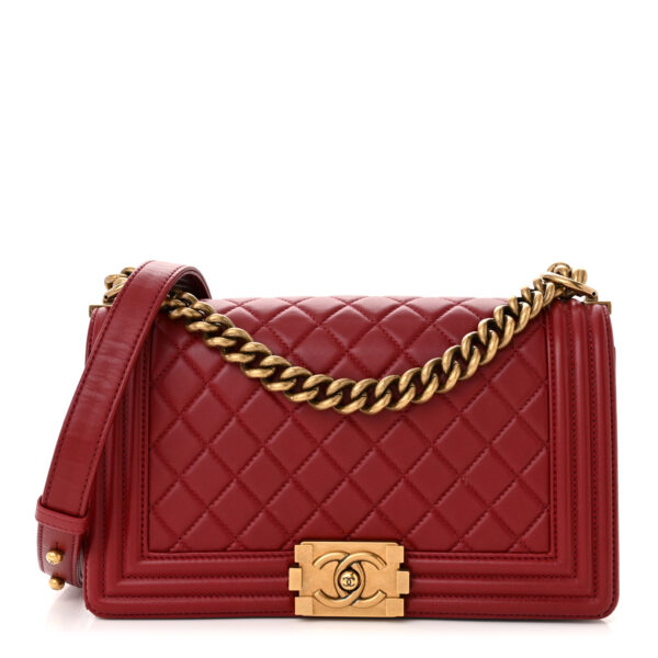Description This is an authentic CHANEL Lambskin Quilted Medium Boy Flap in Dark Red. This chic shoulder bag is crafted of luxuriously textured diamond quilted lambskin leather in dark red, with a linear quilted peripheral border. The bag features an aged gold chain-link shoulder strap with a leather shoulder pad, and a matching aged gold...