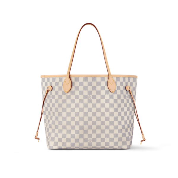 The Neverfull MM tote unites timeless design with heritage details. Made from fresh Damier Azur canvas with natural cowhide trim, it is roomy yet not bulky, with side laces that cinch for a sleek allure or loosen for a casual look. The slim leather handles slip easily over the shoulder or arm. Lined in colorful...