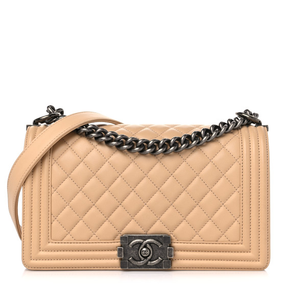Description This is an authentic CHANEL Calfskin Quilted Medium Boy Flap in Beige. This stylish shoulder bag is crafted of beautiful diamond quilted calfskin leather in beige. The bag features a ruthenium chain shoulder strap with a leather shoulder pad and a full front flap with linear quilted borders and a ruthenium Chanel CC Boy...