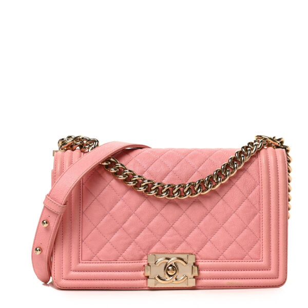 Description This is an authentic CHANEL Caviar Quilted Medium Boy Flap in Pink. This chic shoulder bag is crafted of luxurious textured diamond quilted caviar leather in a peach color with a border of linear quilted leather. The bag features an aged gold chain-link shoulder strap with a shoulder pad and a unique front squared...