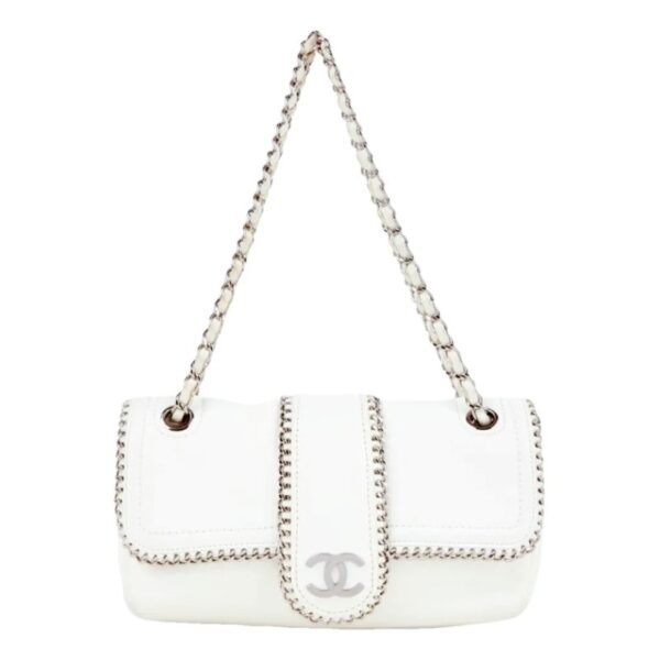 This is an CHANEL Lambskin Small Madison Flap in White. This shoulder bag is composed of lambskin leather with silver tone chain borders. The bag features chain link shoulder straps threaded with leather, a chain that is incorporated around the periphery of the flap, and chain around the edge of the cross-over strap with a...