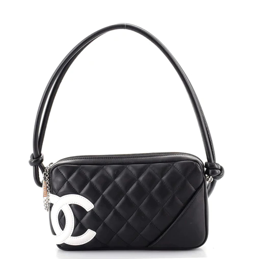 Classic and iconic Chanel small Cambon Ligne tote rendered in a black quilted calfskin featuring contrast interlocking 'CC' appliqué and knotted shoulder straps. Features: Two Leather Shoulder Straps Zip Closure Two Interior Zip Pockets Leather Fabric Lining Silver Hardware Details: Length: 8" (20 cm) Height: 9.5" (24 cm) Depth: 3.75" (9 cm) Strap Drop: 7"...