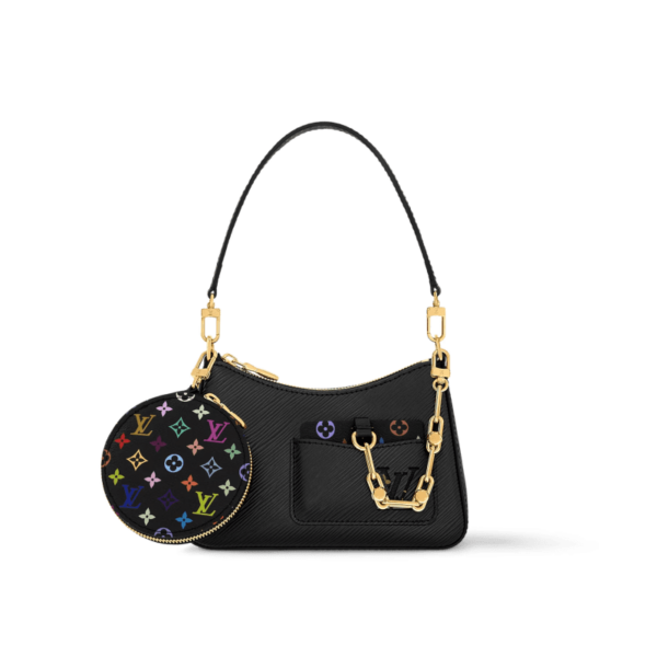 Twisting elegance with edge, the Marellini is crafted from the House’s richly textured Epi leather in bijou proportions big enough to fit daily essentials, including a large smartphone. Rebellious chunky golden chains secure a round coin purse and a mirror to the outside, both of which strike a playful contrast in the Louis Vuitton x...
