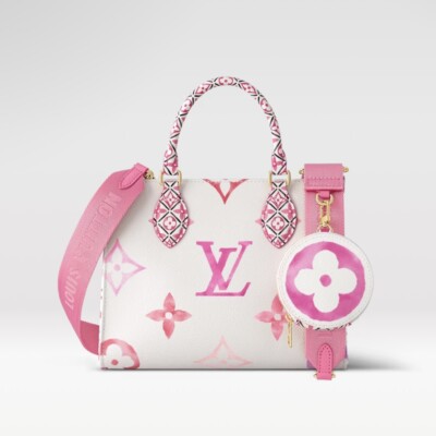 尺寸:约25 x 19 x 11.5厘米(长x高x宽),适合放置迷你iPad、手机、钱包和日常必需品。 材质: Monogram Giant涂层帆布(浅奶油色底色,带粉色Monogram标志); 帆布饰边和手柄印有Monogram预订细节; 织物衬里,金色五金配件。