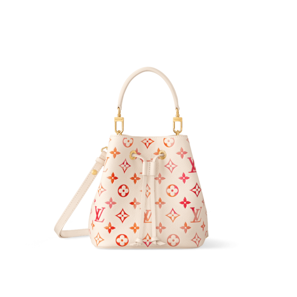 The Aquarelle collection brings a colorful element to the Monogram Empreinte leather of this compact NéoNoé BB bucket bag. Inspired by the soft hues of sunset, a digital printing technique creates orange, pink and fuchsia shades within the Monogram embossing of the leather. A removable handle and a removable and adjustable strap offer multiple carry...