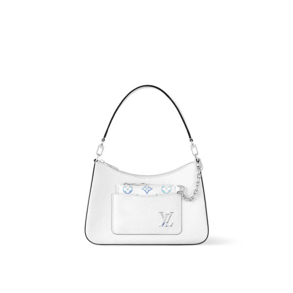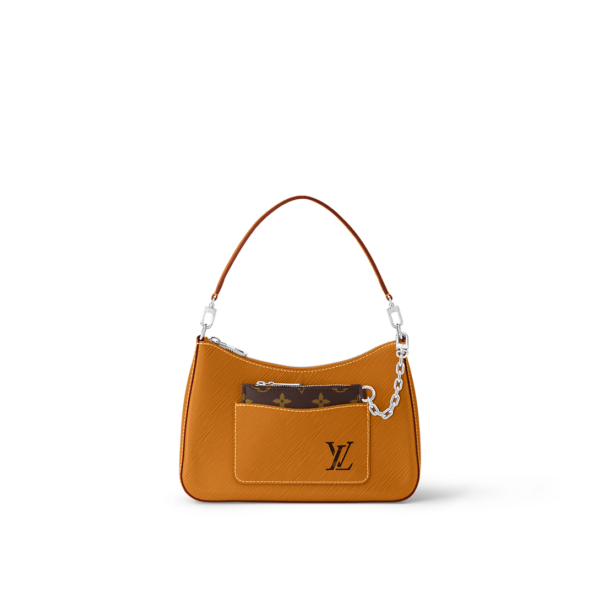 Product details The stylish Marelle handbag is fashioned from grained Epi leather and features a front outside pocket with a removable zipped pouch in Monogram Tiles canvas, hooked to the bag with a detachable chain. It has a removable top handle for hand, shoulder, and elbow carry and an adjustable and detachable leather strap for...