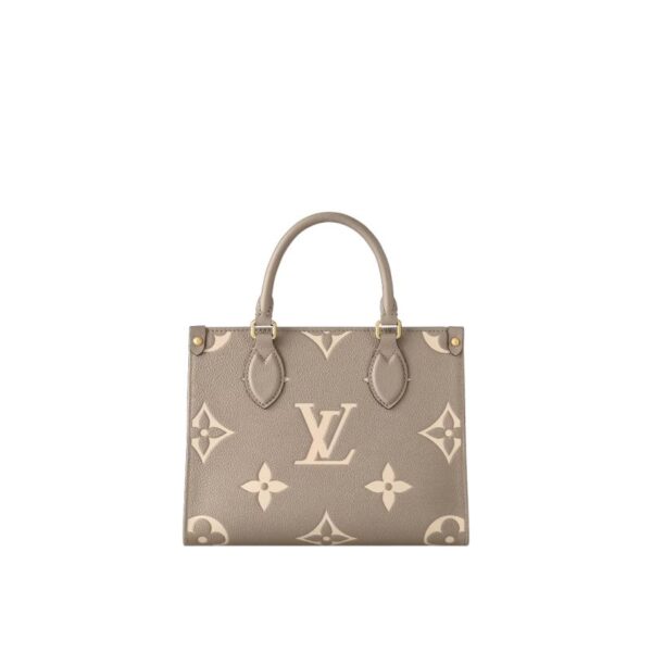Product details Inspired by Louis Vuitton’s famous Sac Plat from 1968, the Onthego PM tote is fashioned in Monogram Empreinte leather, embossed with a Giant Bicolor Monogram pattern. This smaller version of the original Onthego fits essentials such as an iPad Mini. Articulated top handles and an adjustable removable strap offer a variety of carry...