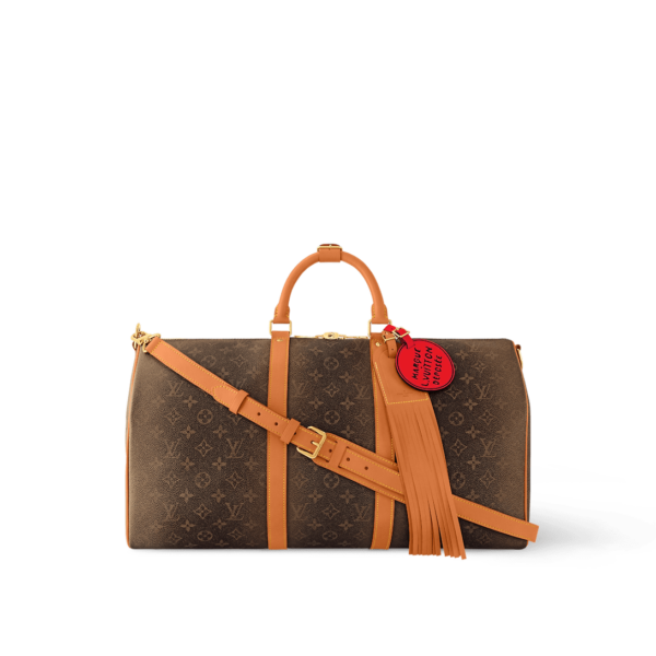Unveiled at the Fall-Winter 2024 show, this Keepall Bandoulière 50 is fashioned from Monogram Dust coated canvas for a vintage allure. Paired with aged cowhide and gold-toned hardware, this bag is Pharrell Williams’ homage to the Maison’s heritage. It is signed with the red “Marque L.Vuitton Déposée” charm and the fringed leather name tag. 50...
