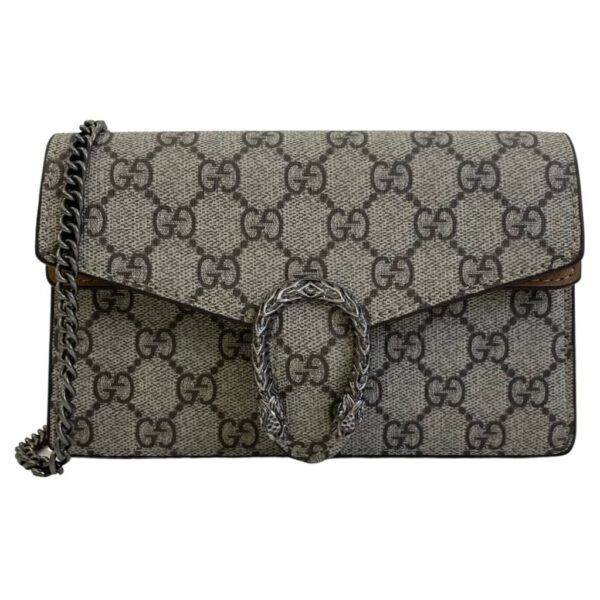 Dionysus Gucci Supreme Super Large Bag GG Supreme canvas, made using an earth-conscious process, with taupe suede detail. Tiger head. Palladium-toned hardware. Attached key ring that can attach to a separate bag. Chain shoulder strap. Pin closure with side release. Size: 28 x 18cm.