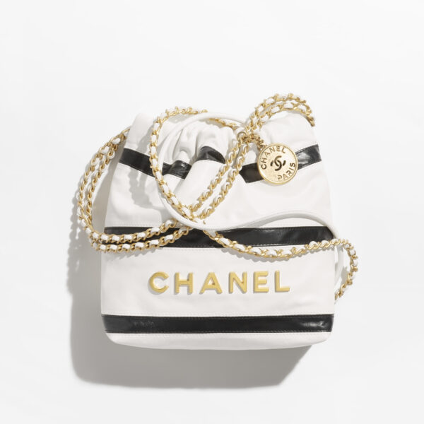 DIMENSIONS 7.8 × 7.4 × 2.3 in (21 x 18 x 6 cm) Shiny Calfskin, Calfskin & Gold-Tone Metal White & Black Ref. AS3980 B16652 NY081