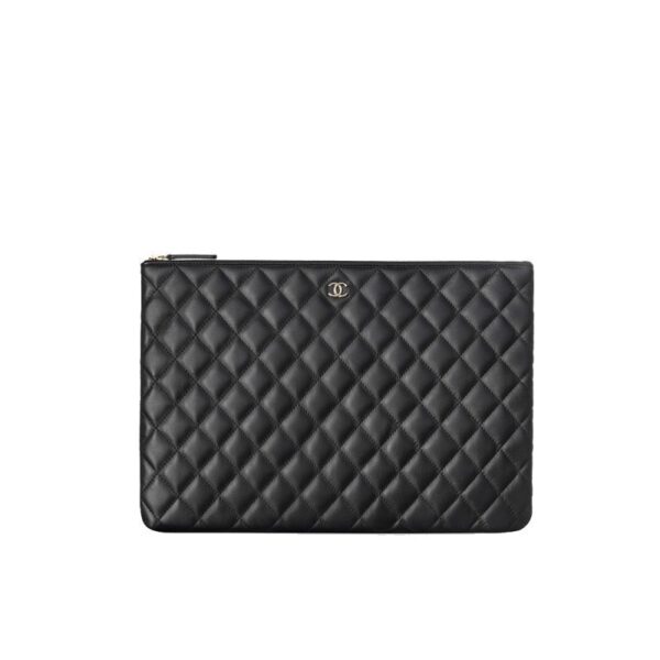 This is an CHANEL Caviar Quilted Large Cosmetic Case in Black. This stylish large cosmetic pouch is crafted of shiny diamond quilted caviar leather in black with a small ruthenium Chanel CC embellishment at the top. The top zipper opens to a spacious burgundy nylon interior. Size 12.50 x 8.5 x 0.8In(31 x 21 x...