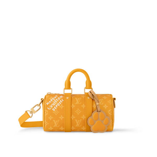The Keepall Bandoulière 25 is a stylish little city bag made from Monogram Heritage canvas with matching-colored leather trim. Pharell Williams signs the bag with the “Marque L.Vuitton Déposée,” originally found on Damier canvas. It comes with a padded bag charm in the shape of a dog’s paw, embossed with a LV Initials. 9.8 x...