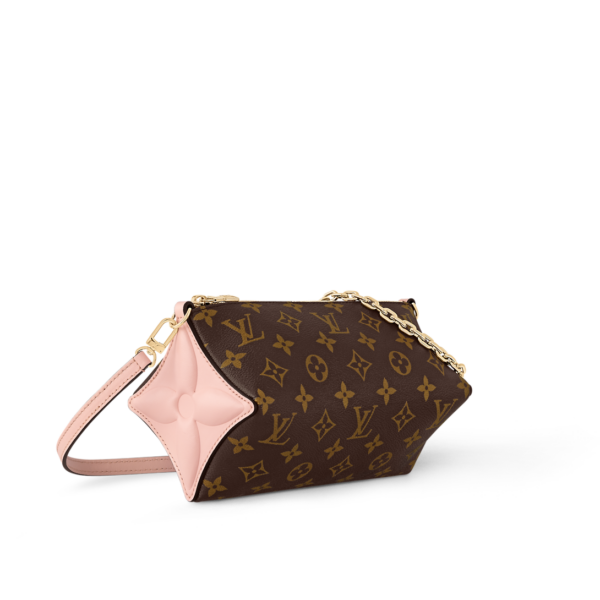 The Bloom pouch combines Louis Vuitton's iconic Monogram canvas with pastel-colored leather on its side panels. This feminine mini bag is notable for its distinctive shape, inspired by a Monogram Flower. It can hold essentials such as a compact wallet, phone, keys and lipstick, and can be worn with or without its delicate, gold-tone chain....