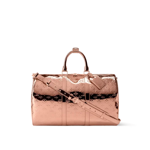 This Keepall Bandoulière 45 is crafted from retro-futuristic Monogram Miroir canvas in an exclusive copper color, paired with pink-gold-tone hardware and a copper-toned mesh lining. The highly resistant canvas makes it suitable for all weather conditions. Sized for carry-on, it features both top handles and a removable, adjustable strap for shoulder wear. 17.7 x 10.6...