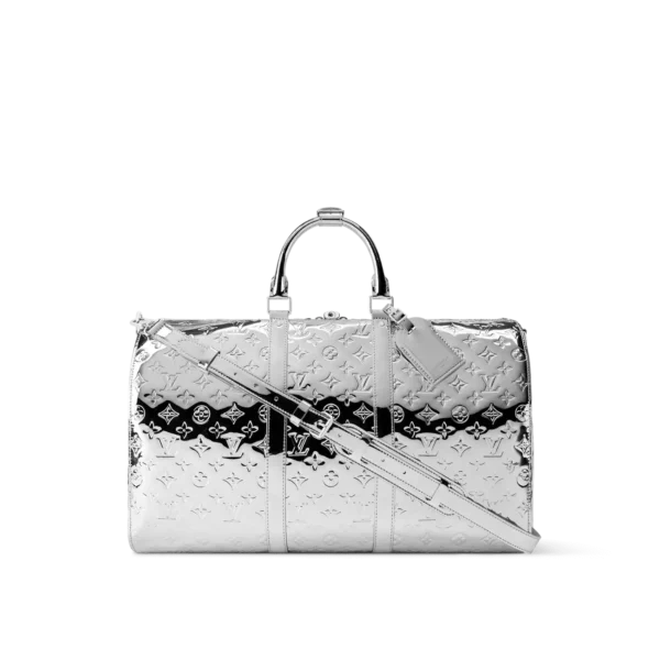 The classic Keepall Bandoulière 50 takes on a space-age feel in Monogram Miroir canvas, a particularly sturdy material thanks to an added layer of mirror-effect laminate. Lined in gray mesh, the interior includes a zipped pocket to keep valuables secure. In addition to top handles, it features a detachable, adjustable shoulder strap for versatile carry...