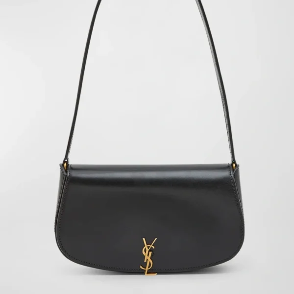 Saint Laurent shoulder bag in calfskin leather Shoulder strap, 9.4"L Flap top with YSL lift clasp closure Exterior, one slip pocket under flap Interior, one slip pocket Bronze hardware Approx. 4.3"H x 8.2"W x 1.7"D Made in Italy